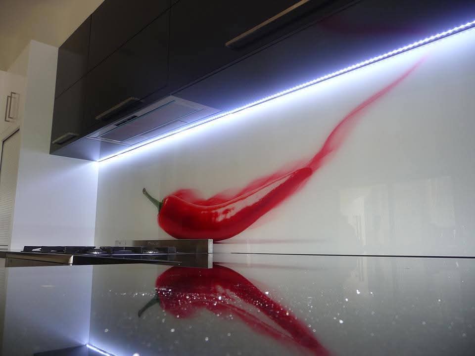 Γυάλινη πλάτη κουζίνας με επένδυση. Δημιουργήστε την πλάτη κουζίνας με επένδυση γυαλιού, στο σχέδιο και το χρώμα που θέλετε.